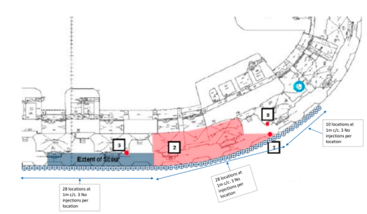The successful trial and testing phases led to the development of a comprehensive treatment plan aimed at stabilising the existing foundations. The strategy involved injecting the geopolymer into a shingle beneath the foundations across ten metres on either side of the failed area. Loose shingle was strategically placed underneath the foundation, and injection tubes were installed to facilitate the geopolymer’s injection directly beneath the foundation, creating a stable and solid base.
